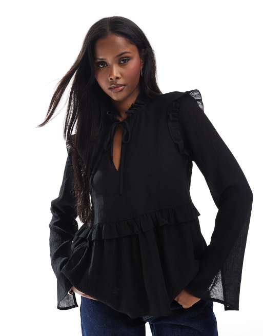 Top negro amplio con lazada al cuello y detalle de volantes de ASOS DESIGN