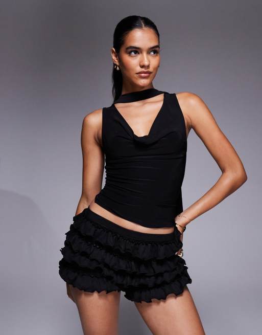 Top negro ceñido con cuello desbocado y detalle de fular de ASOS DESIGN