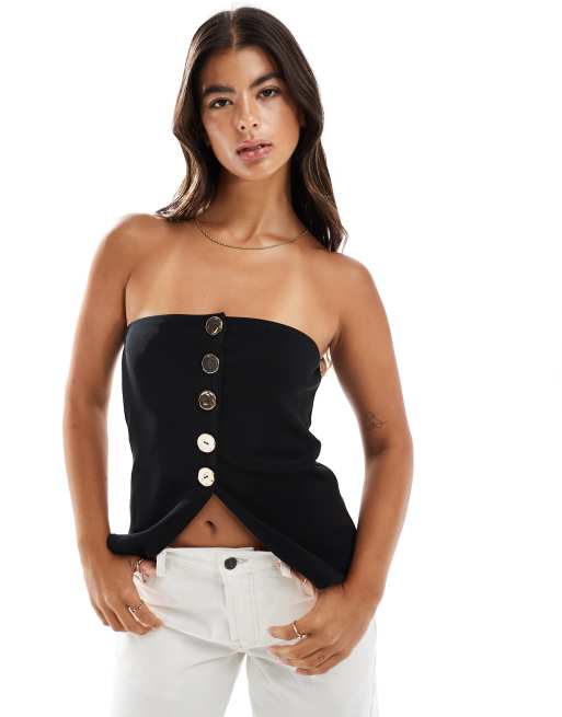 Top negro de canalé con escote palabra de honor y botones dorados en la parte delantera de ASOS DESIGN