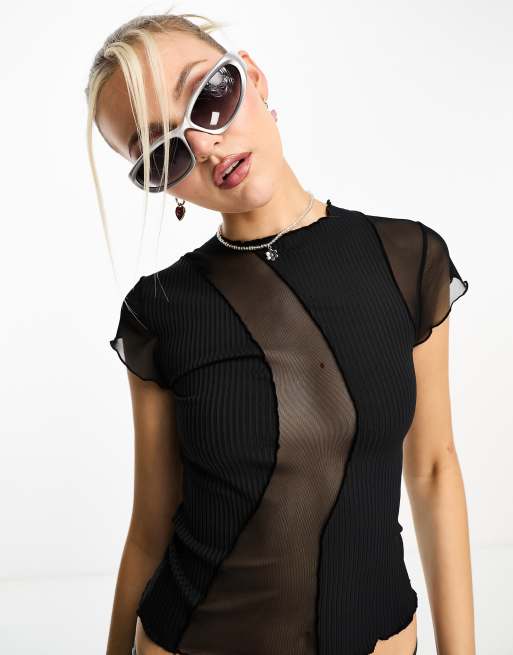 Top negro de manga corta con panel de malla de canalé de ASOS DESIGN