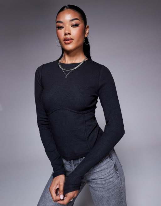 Top negro de manga larga con detalle bajo el pecho de canalé de ASOS DESIGN