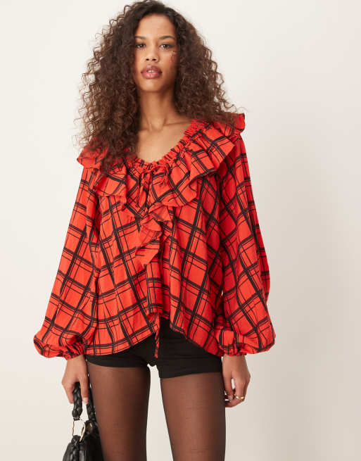 Top rojo a cuadros con volantes y cuello de pico de ASOS DESIGN