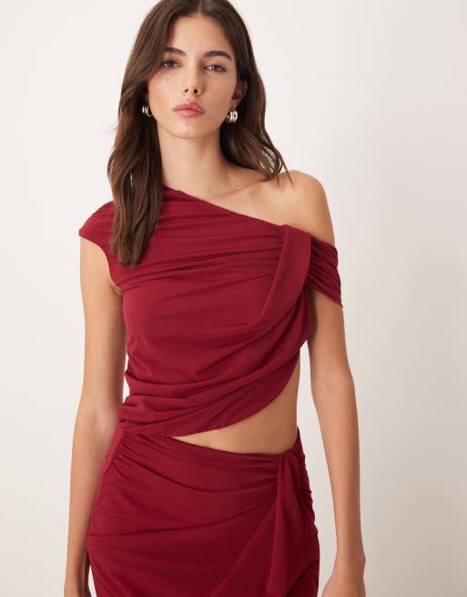 Top rojo semitransparente con diseño asimétrico drapeado de malla de ASOS DESIGN (parte de un conjunto)