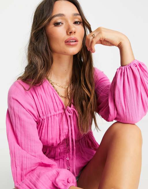 Top rosa de manga larga con botones y lazada en la parte delantera, y acabado rugoso natural de ASOS DESIGN
