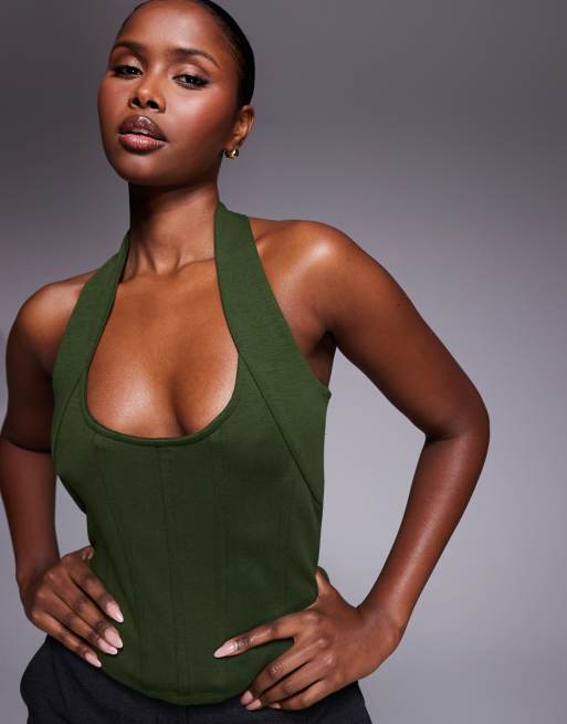 Top verde con cuello halter y ballenas de tejido entrelazado de ASOS DESIGN