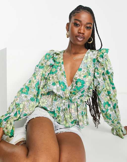 Top verde cruzado con estampado floral y bajo de sobrefalda con bordes festoneados de ASOS DESIGN