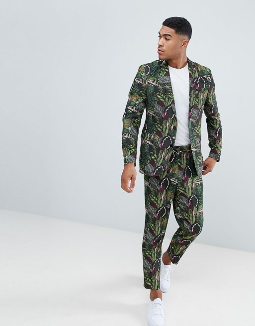 Traje ajustado con estampado verde botánico y efecto lino de ASOS DESIGN