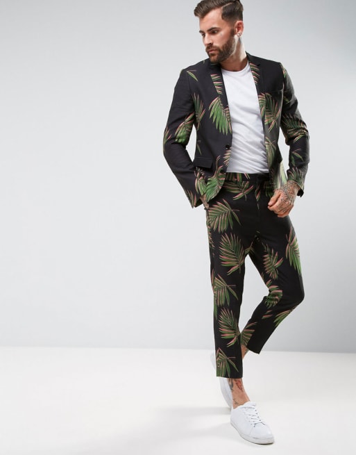 Traje ajustado de lino en azul marino con estampado de hojas de ASOS