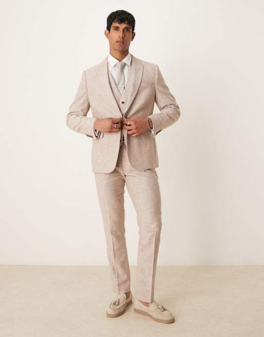 Traje marrón de corte slim con patrón de espiga de mezcla de lino y algodón de ASOS DESIGN