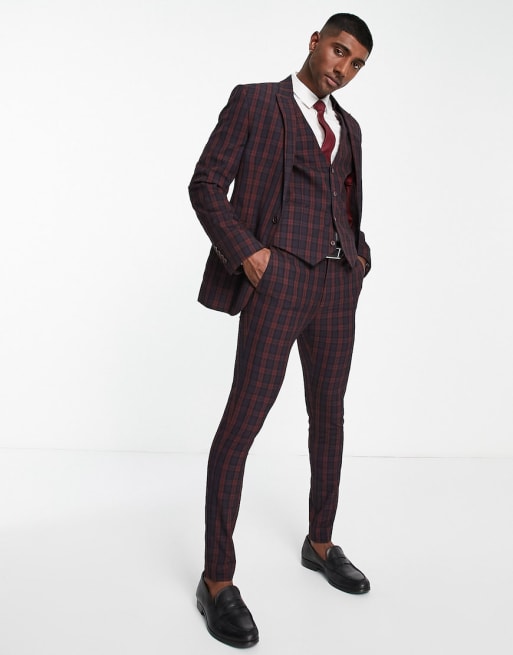 Traje muy ajustado con estampado escocés en burdeos de ASOS DESIGN