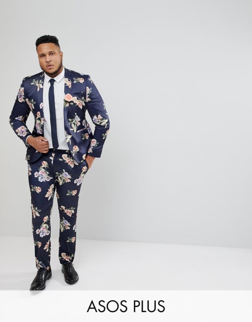 Traje muy ajustado en azul marino con estampado floral de ASOS PLUS Wedding