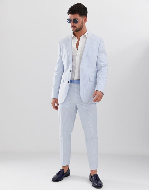 Traje slim de sirsaca de algodón en azul y blanco a rayas de ASOS DESIGN