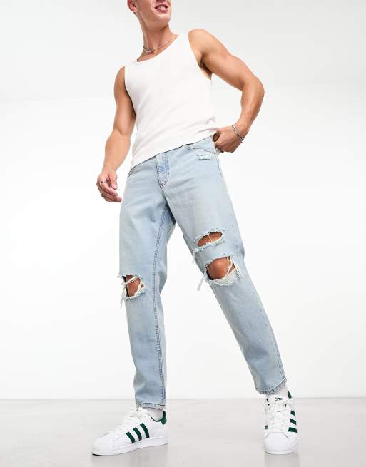 Vaqueros azules rígidos clásicos con lavado claro y rodillas muy rasgadas de ASOS DESIGN