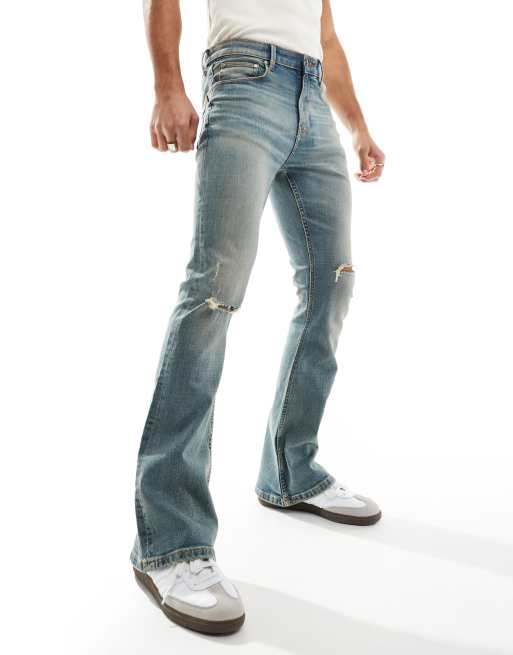 Vaqueros de campana azules con tintado envejecido y roturas en las rodillas de ASOS DESIGN