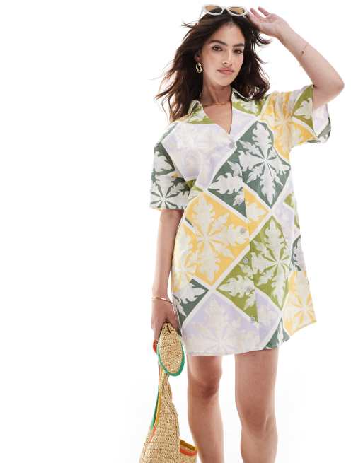 Vestido camisero corto de corte cuadrado y manga corta con estampado de mosaico de tejido efecto lino de ASOS DESIGN