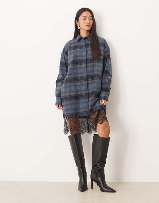 Vestido camisero corto gris y tostado a cuadros con bajo redondeado asimétrico de ASOS DESIGN