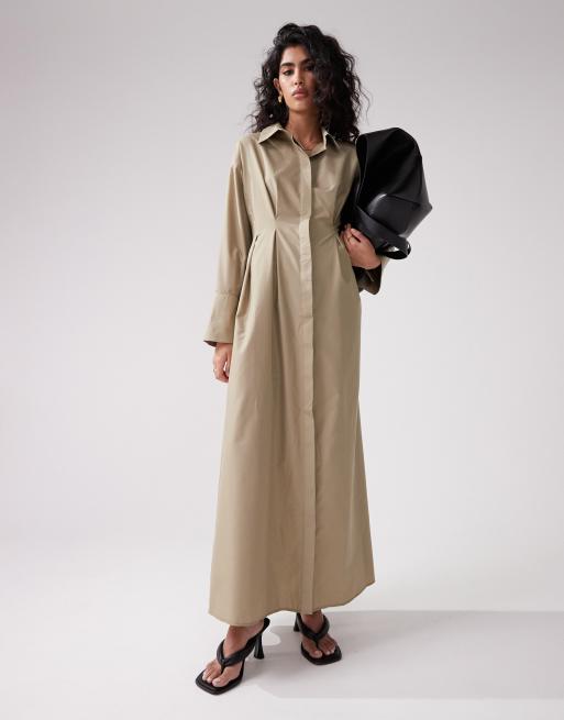 Vestido camisero largo caqui con pinzas en la cintura de ASOS DESIGN