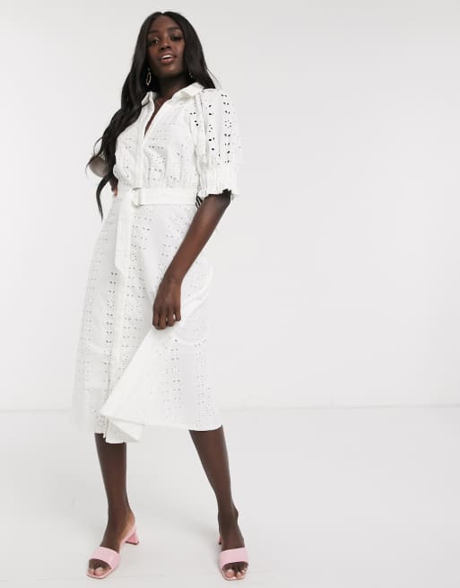 Vestido camisero midi bordado con manga abullonada y cinturón con hebilla en forma de D en blanco de ASOS DESIGN