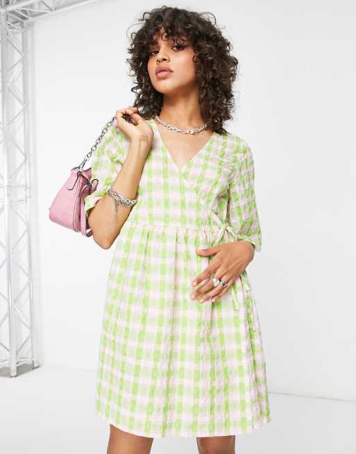 Vestido corto a cuadros verdes y rosas de corte amplio con diseño cruzado de ASOS DESIGN