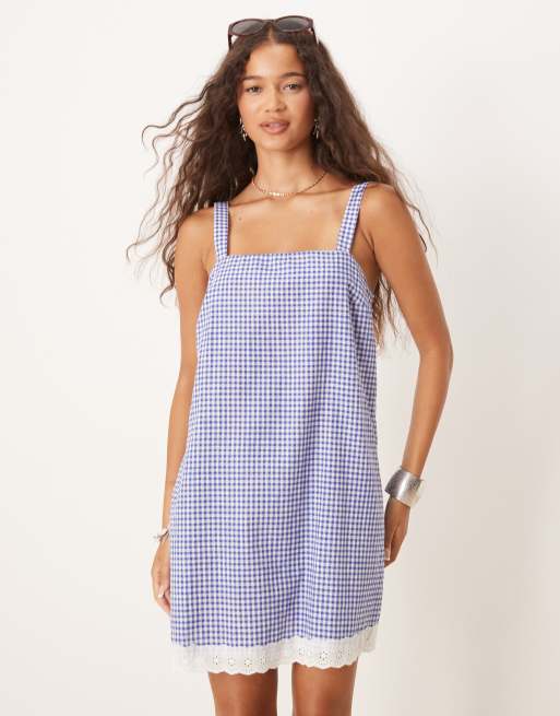 Vestido corto a cuadros vichy azul marino con vuelo y bajo bordado de ASOS DESIGN