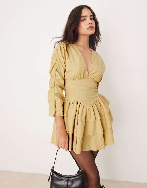 Vestido corto amarillo pastel con lazada en la cintura y volante en el bajo de ASOS DESIGN