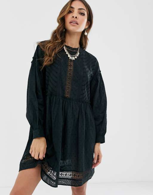 Vestido corto amplio con cuello alto en plumeti con ribetes de encaje en negro de ASOS DESIGN