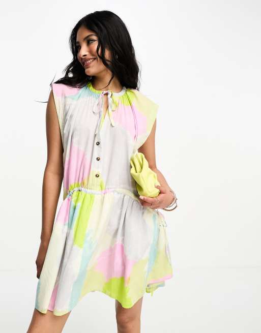 Vestido corto amplio con estampado abstracto luminoso, bajo redondeado y detalle de cordón ajustable de ASOS DESIGN Curve
