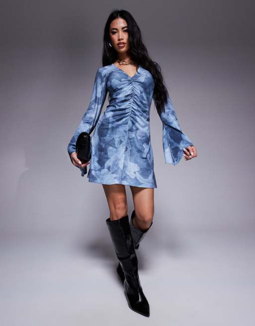 Vestido corto azul con estampado floral, cuello de pico, detalle fruncido y mangas acampanadas de ASOS DESIGN