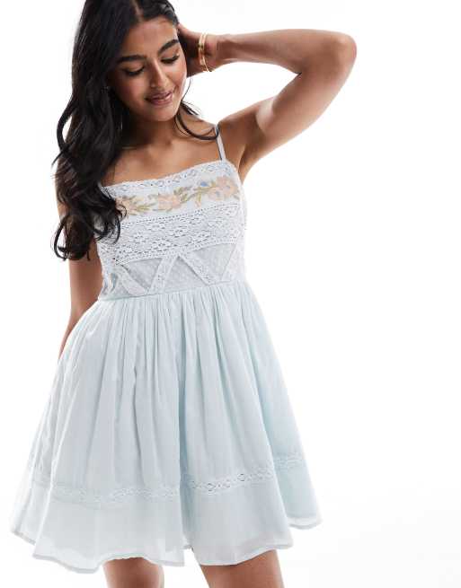 Vestido corto azul pálido de tirantes con diseño bordado y ribetes de encaje de ASOS DESIGN