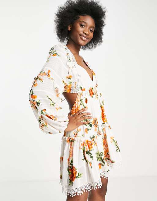 Vestido corto escalonado con estampado floral, detalle de ribete e inserto de encaje de ASOS DESIGN