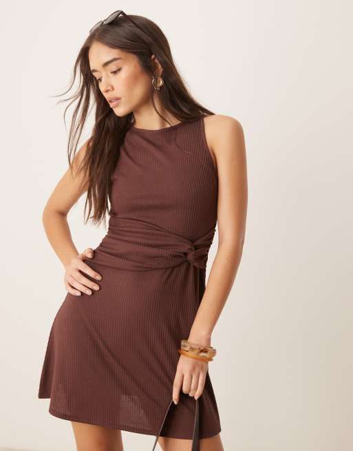 Vestido corto marrón chocolate sin mangas con espalda de nadadora y detalle anudado en la cintura de canalé de ASOS DESIGN