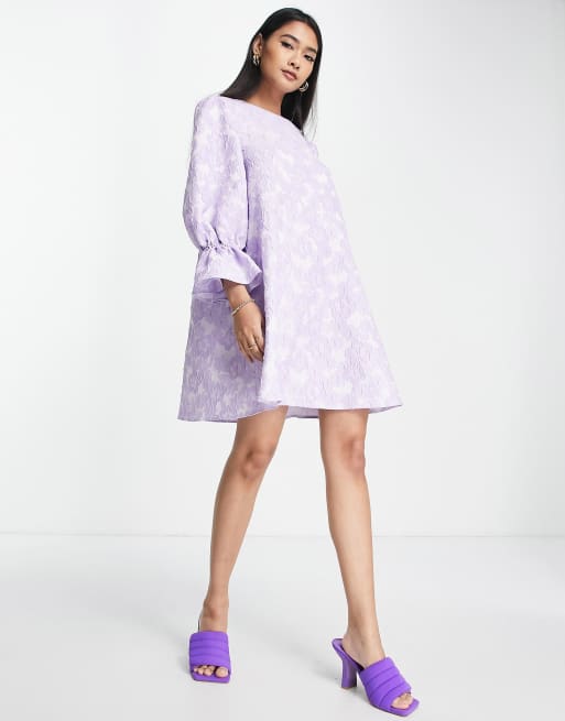 Vestido corto morado con vuelo, volantes en los puños y diseño floral de jacquard de ASOS DESIGN