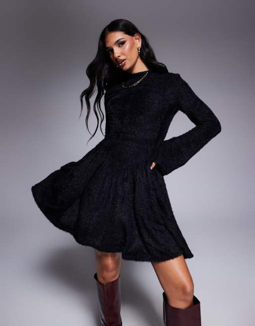 Vestido corto negro con cuello alto y cintura baja en forma de pico de punto mullido de ASOS DESIGN