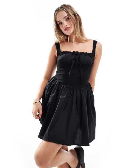 Vestido corto negro de tirantes de canalé con falda de popelina de ASOS DESIGN