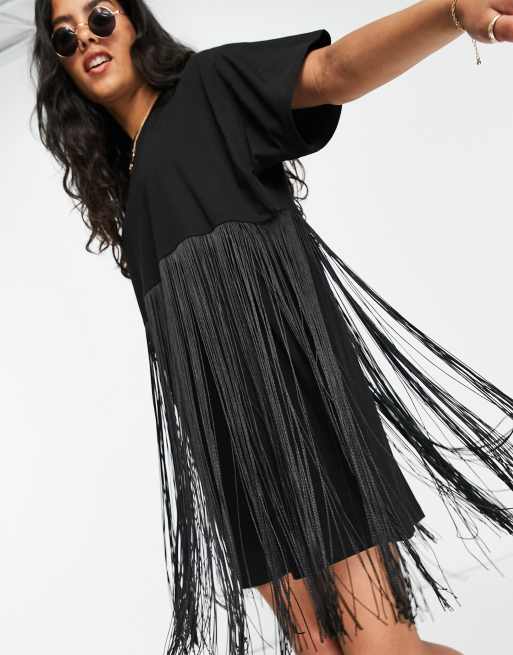 Vestido corto negro estilo camiseta con flecos de ASOS DESIGN