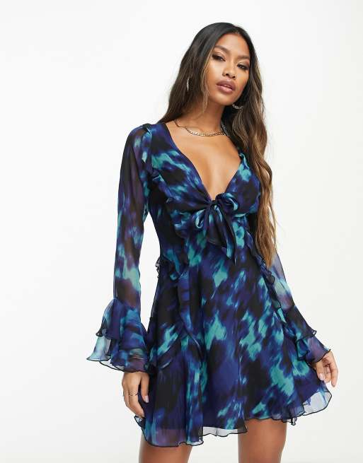 Vestido corto negro y azul escotado con estampado abstracto, volantes y lazada delantera de ASOS DESIGN