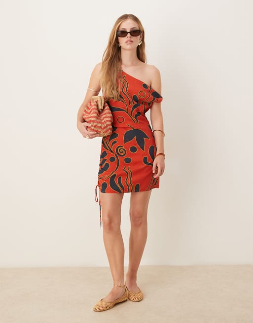 Vestido corto rojo con diseño estampado, escote Bardot y lateral fruncido de ASOS DESIGN