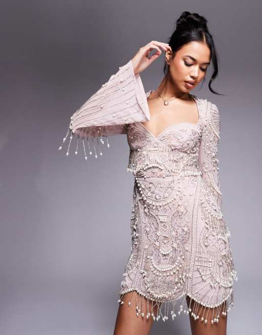 Vestido corto rosa claro con bordes festoneados, mangas acampanadas y diseño con abalorios de ASOS DESIGN