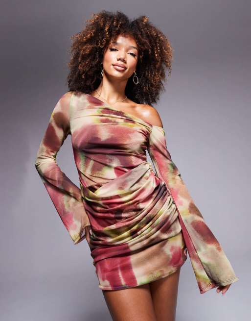 Vestido corto rosa con hombro descubierto, manga acampanada con volante y estampado difuminado de malla de ASOS DESIGN