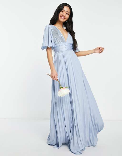 Vestido de dama de honor largo azul plisado con cintura cruzada y mangas acampanadas de satén de ASOS DESIGN