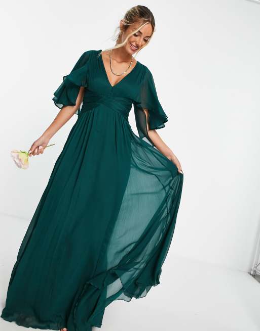 Vestido de dama de honor largo verde bosque con mangas capa, diseño drapeado, cuerpo fruncido y cintura cruzada de ASOS DESIGN