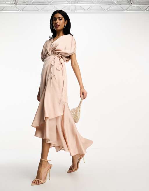 Vestido de dama de honor midi rosa rubor con detalle fruncido y diseño cruzado de satén de ASOS DESIGN