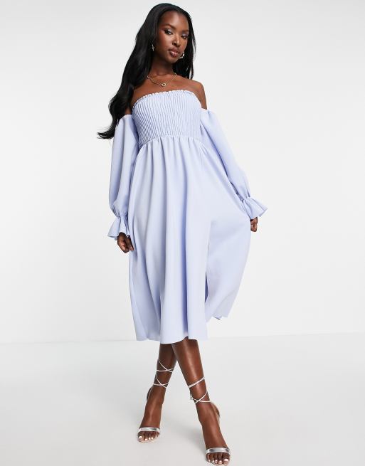 Vestido de graduación midi azul pastel fruncido con escote Bardot y mangas estilo blusón de ASOS DESIGN