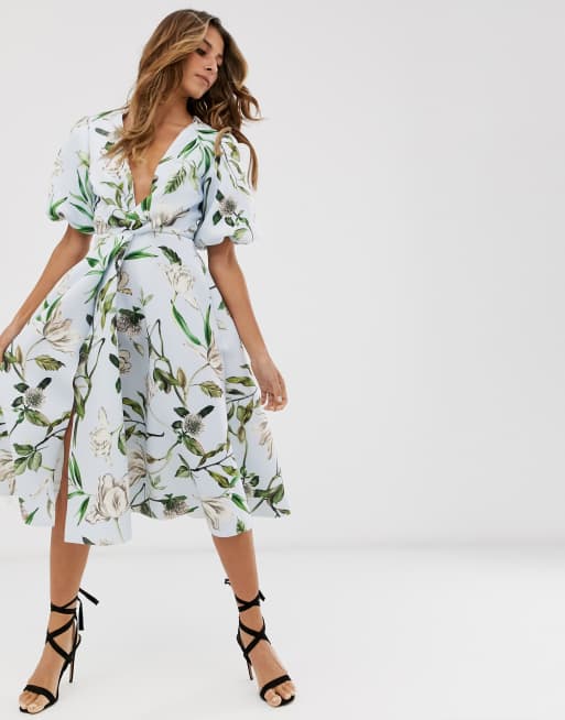 Vestido de graduación midi con detalle retorcido en la manga y flores Bubble de ASOS DESIGN