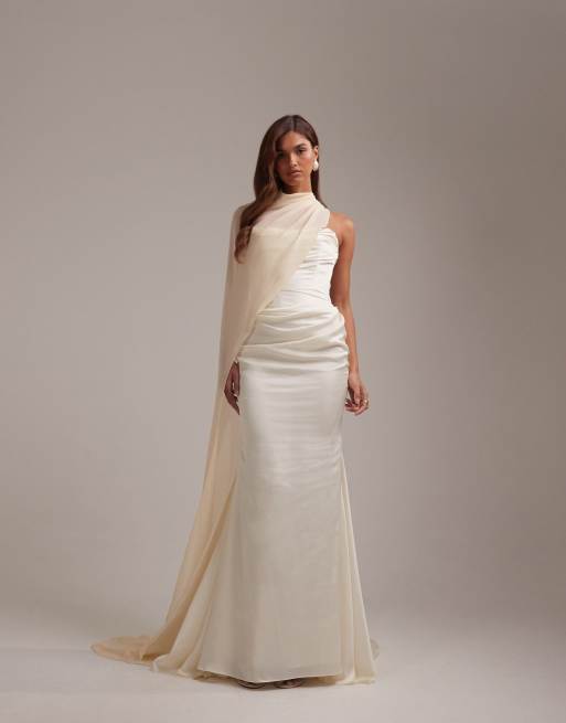 Vestido de novia largo blanco marfil con escote palabra de honor drapeado de ASOS DESIGN