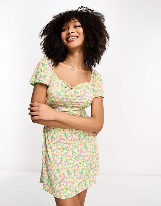 Vestido de tarde corto en tonos pastel con estampado floral, mangas fluidas y cuello desbocado de ASOS DESIGN
