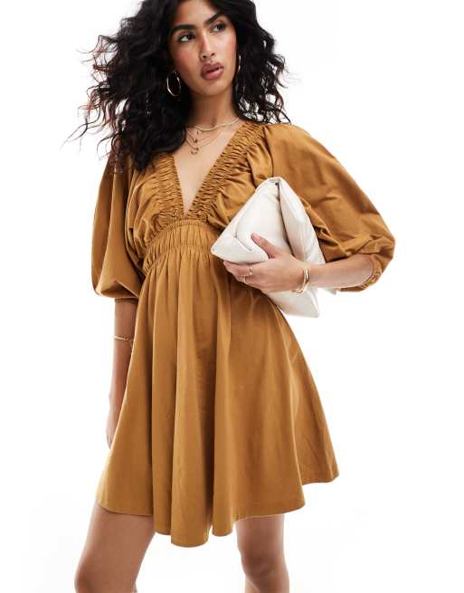 Vestido de tarde corto marrón escotado y elástico con cintura fruncida de ASOS DESIGN