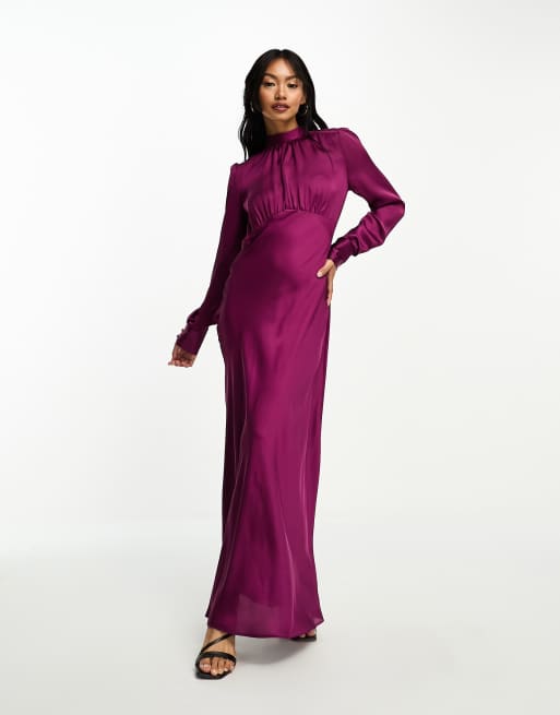 Vestido de tarde largo morado con cuello subido de satén de ASOS DESIGN