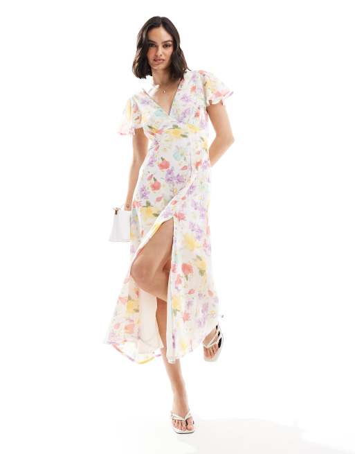 Vestido de tarde midi con estampado floral de tonos pastel y detalle de costuras de ASOS DESIGN
