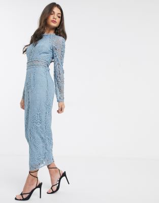Vestido de tubo azul polvareda de encaje con manga larga y ribetes de encaje geométrico de ASOS DESIGN